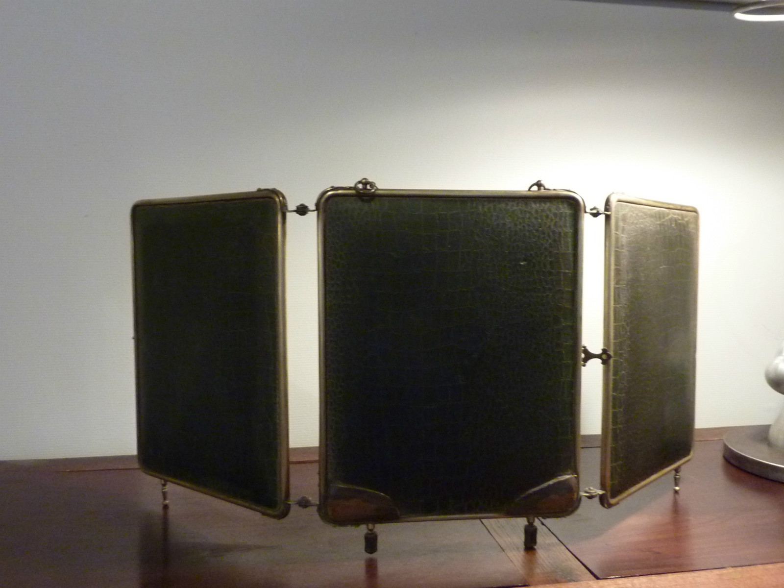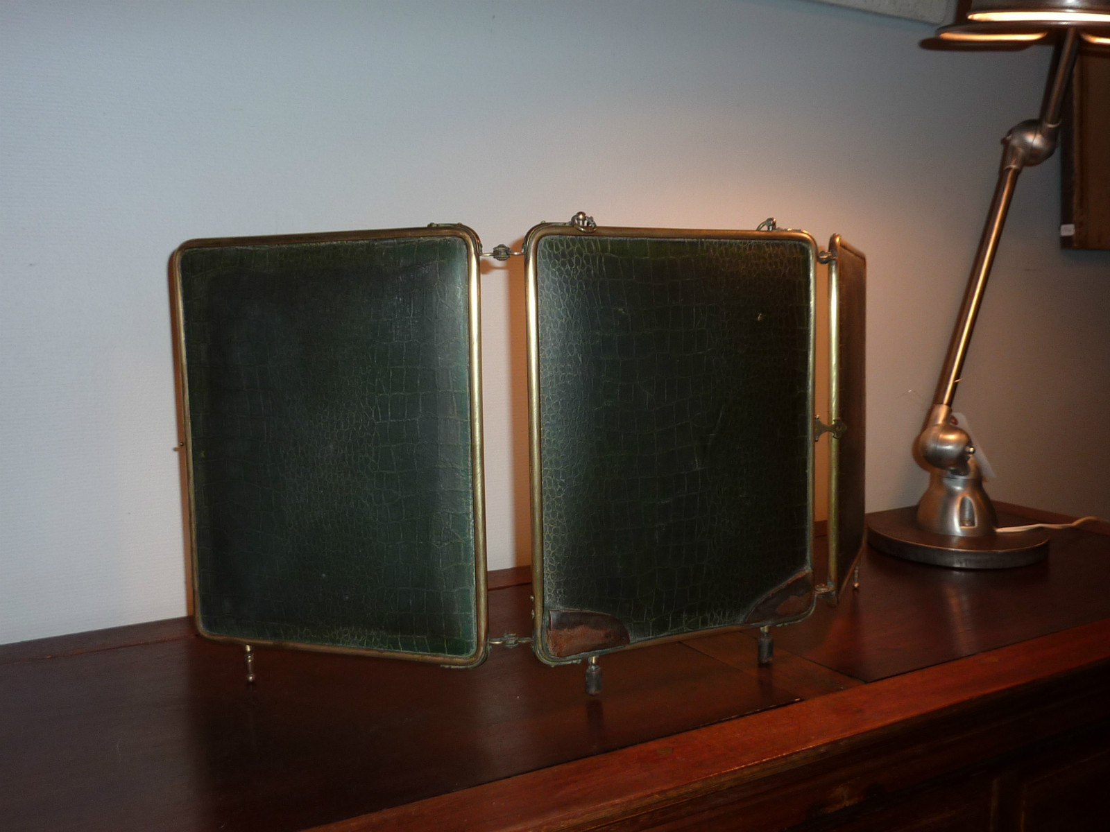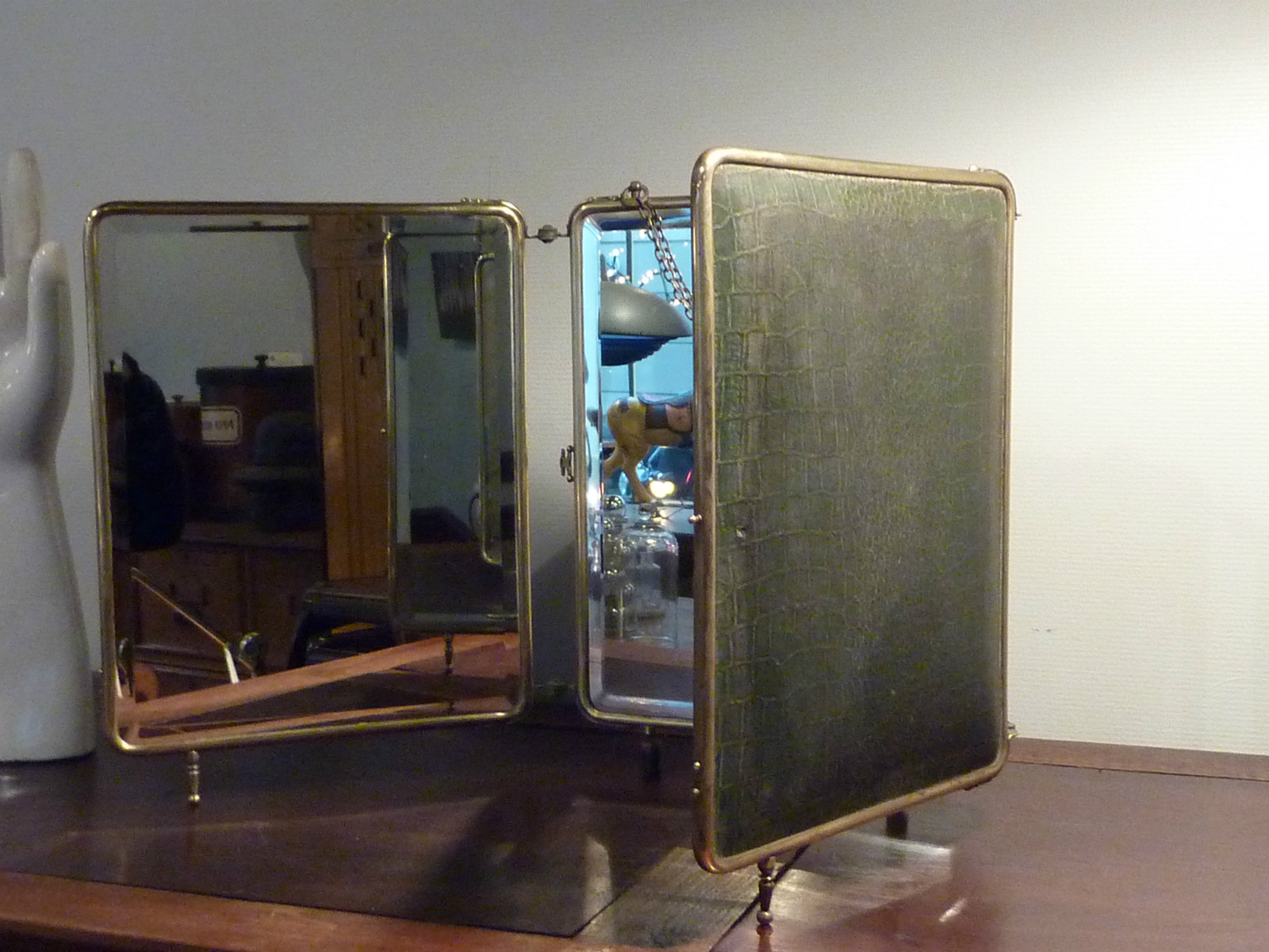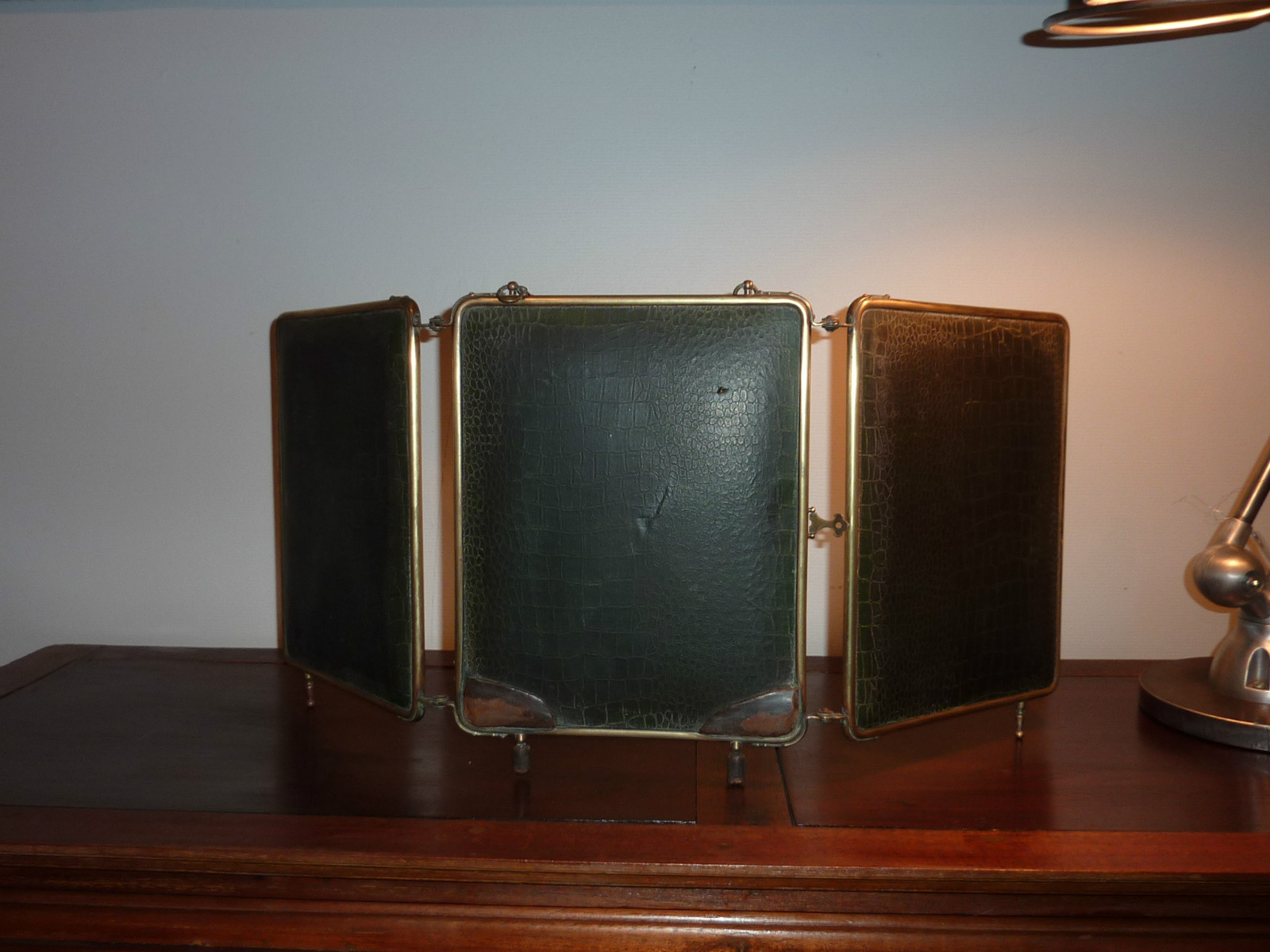 Superbe miroir de barbier triptyque des années 40. A poser ou à suspendre. Glaces biseautées en très bon état, cerclage chromés, dos en cuir façon croco et chainette en acier pour l’accrocher.