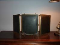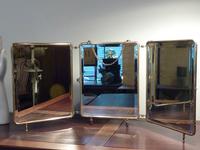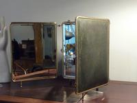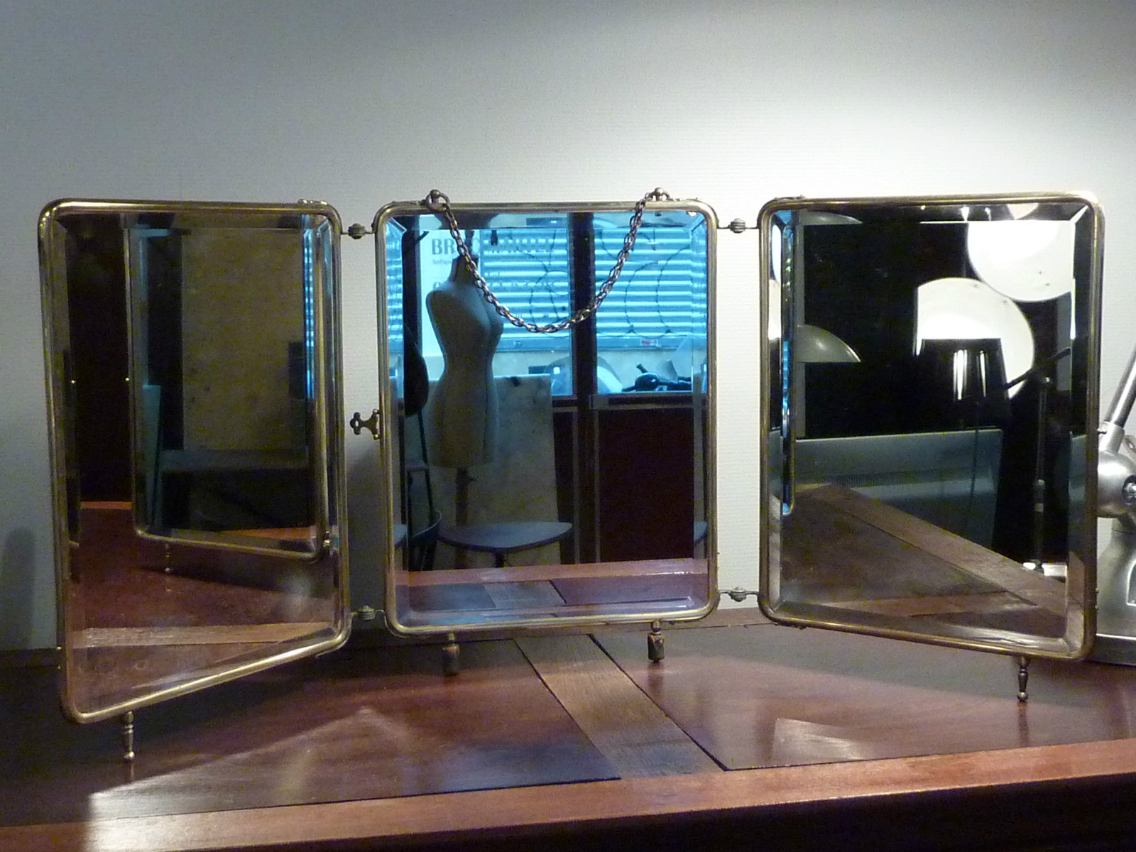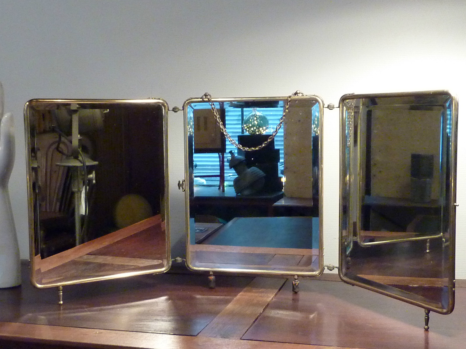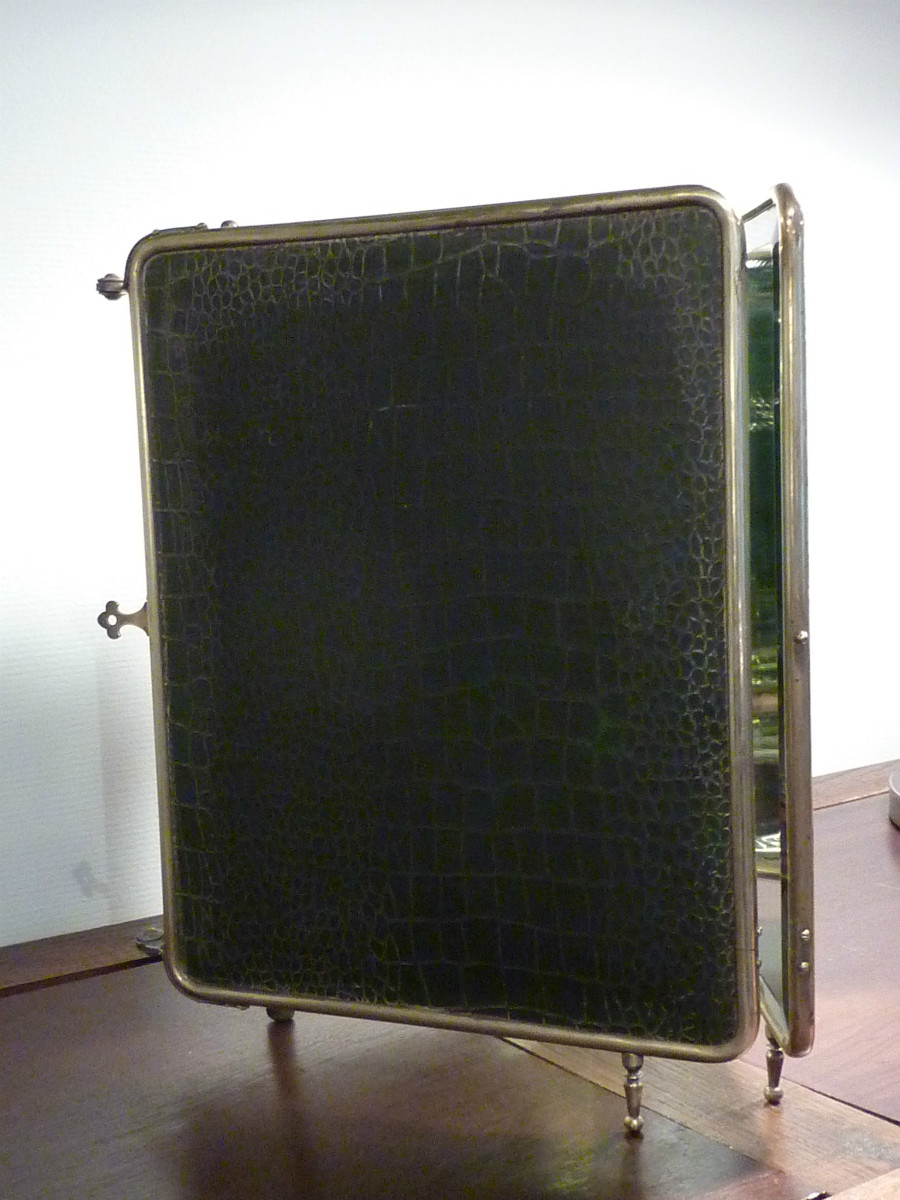 Superbe miroir de barbier triptyque des années 40. A poser ou à suspendre. Glaces biseautées en très bon état, cerclage chromés, dos en cuir façon croco et chainette en acier pour l’accrocher.