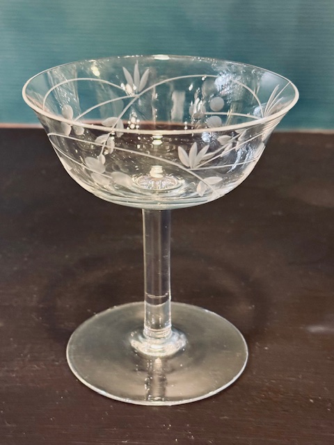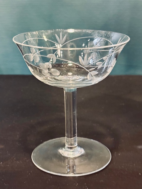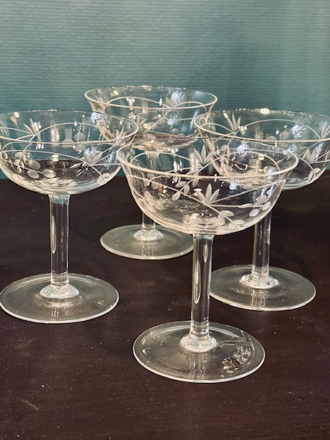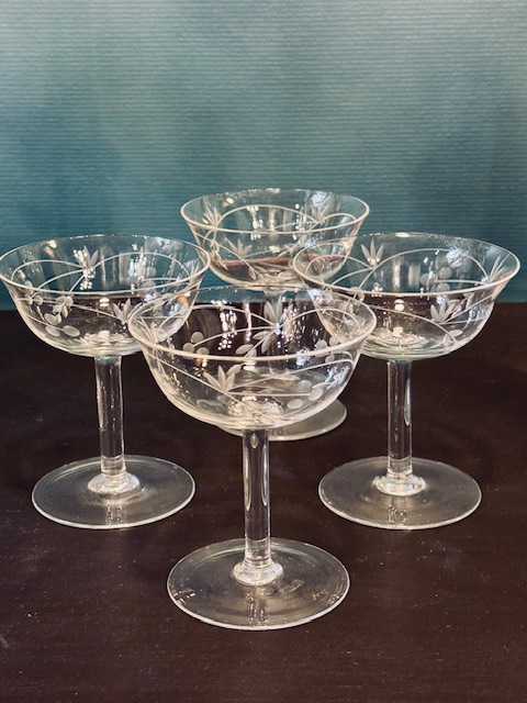 4 coupes à champagne en verre vintage décor ciselé de fleurs