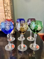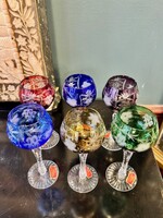 Estampillés au pied Cristallerie de Lorraine (voir photo) - Couleur teinté dans la masse: 6 couleurs différentes (jaune /bleu/vert/rouge/amethiste/ bleu roy) et ciselés d'un décor de fleurs, grappe de raisin, et rosace
