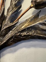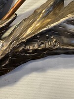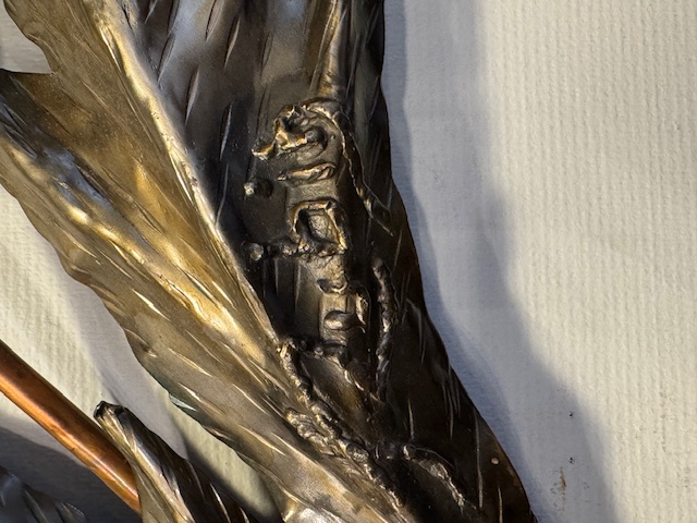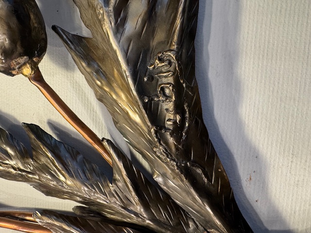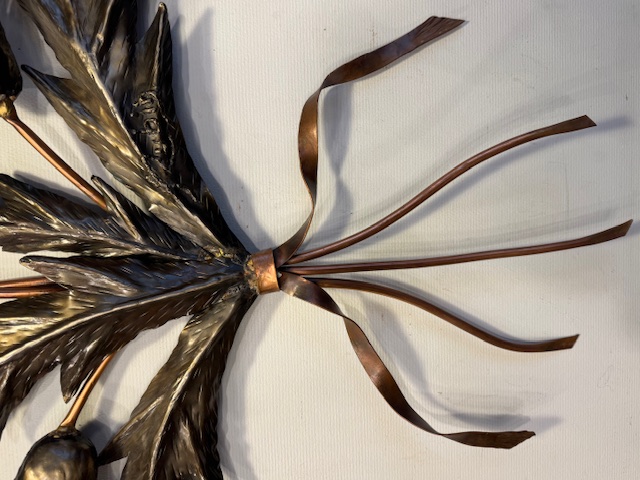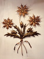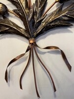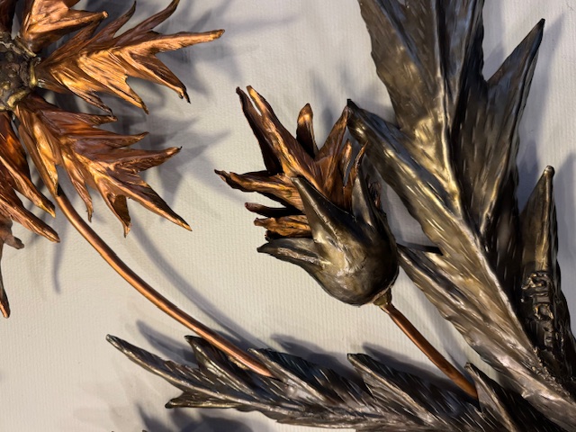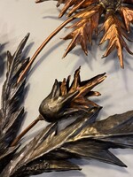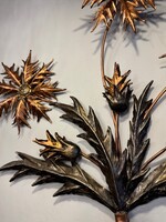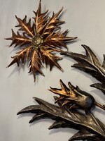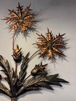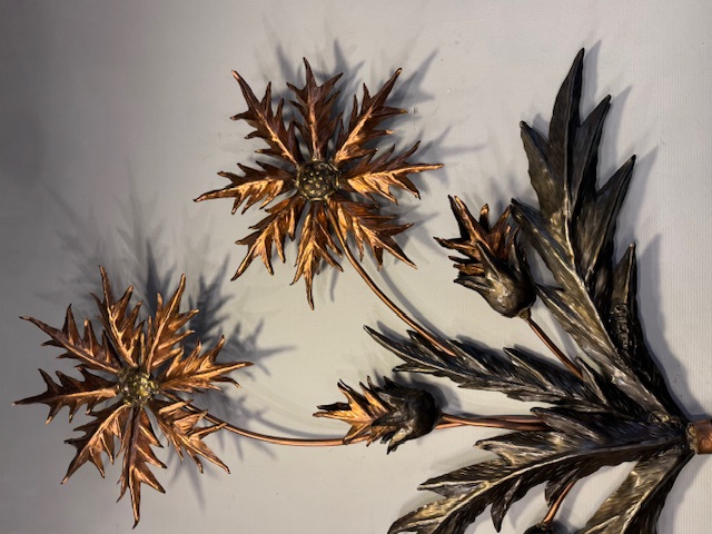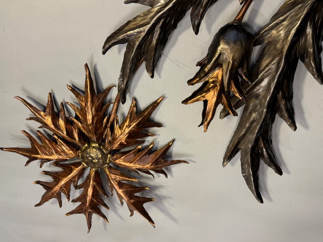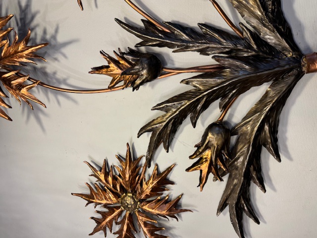 Grande sculpture applique murale en cuivre et métal patiné représentant un bouquet de chardons